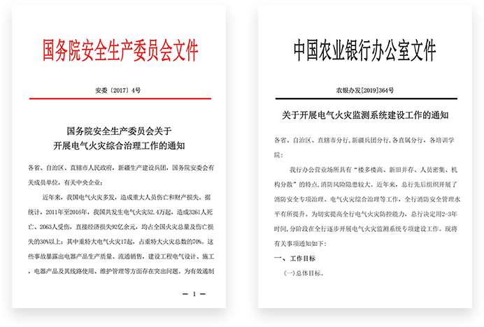 2017年国务院安全生产委员会下发了《关于开展电气火灾综合治理工作的通知》(安委〔2017〕4号)文件,在全国范围内开展电气火灾综合治理部署工作,与此同时,各大银行也陆续发布相关政策。例如中国农业银行办公室发布了《关于开展电气火灾监控系统建设工作的通知》,要求“为切实提高全行电气火灾防控能力,总行觉得用2-3年时间,分阶段在全行逐步开展电气火灾监控系统专项建设工作......力争2021年底前,全行自有、自用场所完成电气火灾监控系统建设工作,实现全行用电管理从粗放、传统、低效、向智能、科技、节约转 变”。防范银行电气火灾事故,提升银行智慧化电气综合运营管理能力。